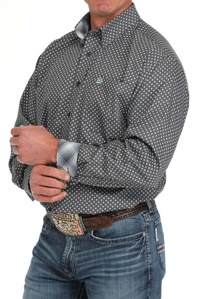 The beloved, classic button down Western shirt in a elevated gray pattern print, contrast cuffs & collar band. Embroidered Cinch logo on single front pocket. Perfect under a sport coat for more formal events too!