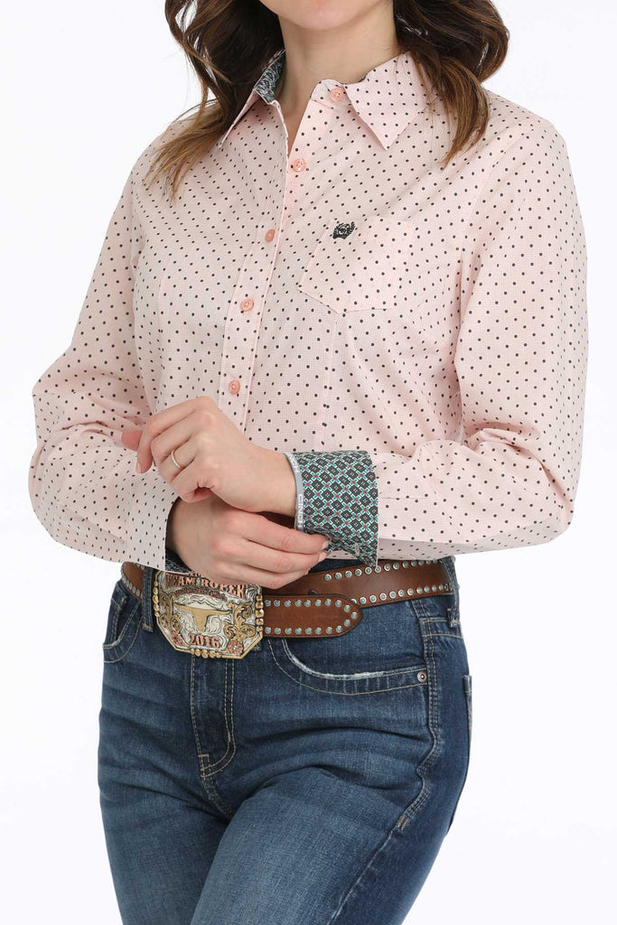 The classic button shirt with some Western styling - soft pink print with contrasting collar band, front placket and cuffs. Embroidered Cinch logo on single front pocket.