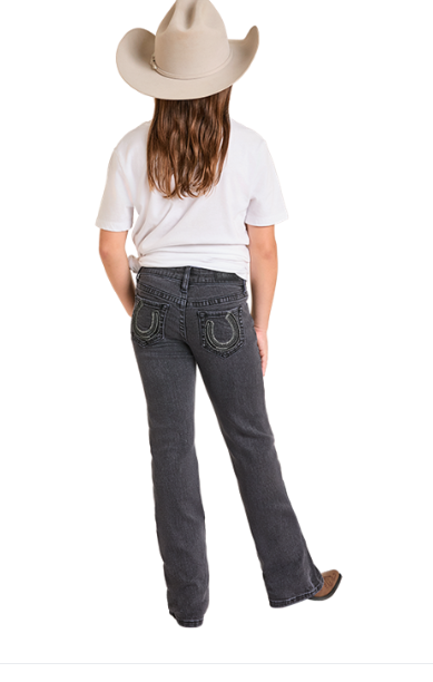Just like the big cowgirls, these distressed black bootcut denim have a fun embroidered horseshoe on the back pocket.
