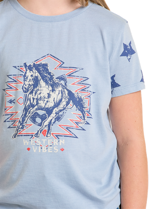 A running horse against a soft baby blue background adds the perfect western vibe to this girls short sleeve tee shirt.