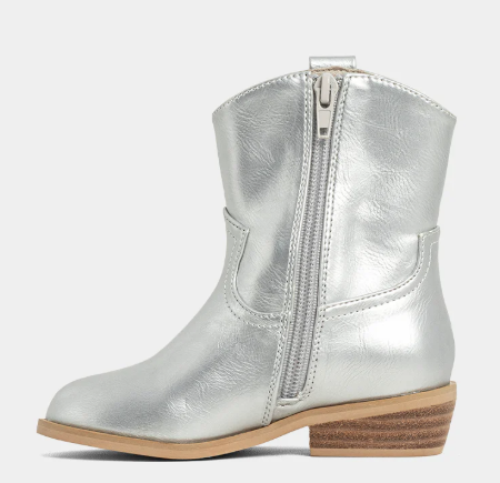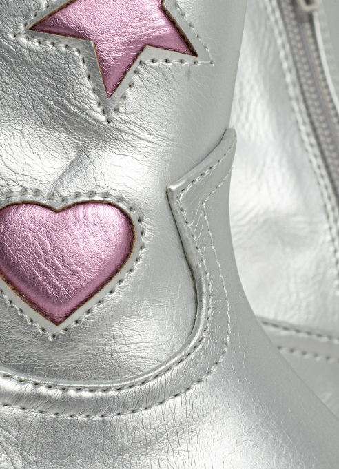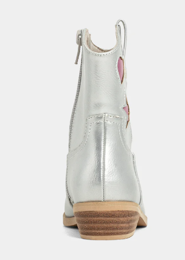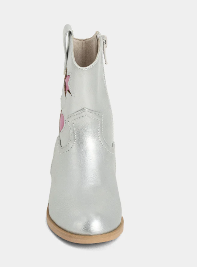 The ZIMBA MINI in Silver is here to shine-literally. This kids-only western-style boot is all about fun with a bold silver faux leather upper and bright pink appliqués in the shape of hearts and stars. The chunky low heel and inner zipper add everyday comfort and easy wear, while the playful design makes it an instant favorite for dress-up days or statement looks. From school to parties, this boot brings sparkle and personality to every step.