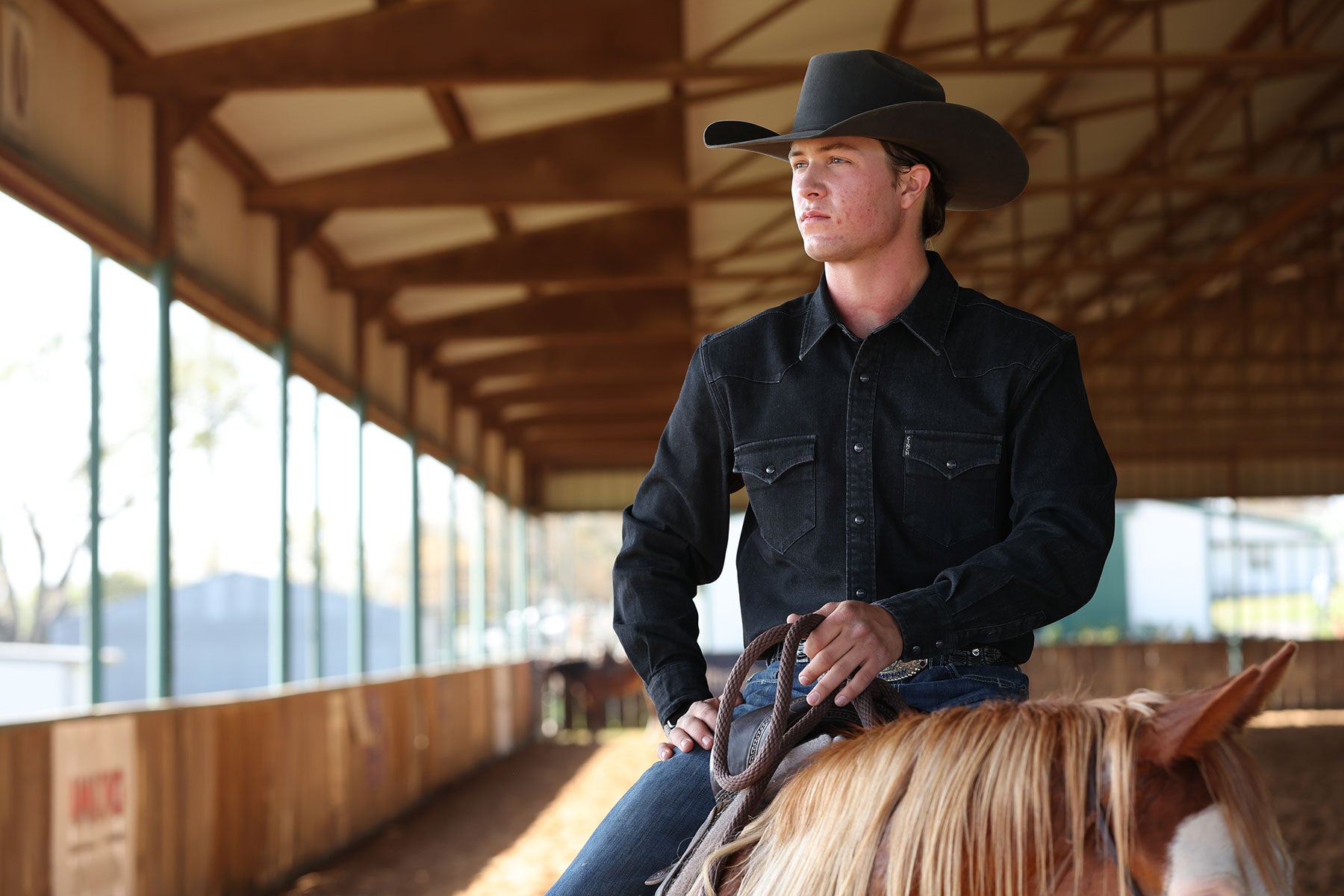A classic denim shirt in a black wash, traditional pearl snaps and western snap front pockets, western yoke.  Stretch fabric for comfort.