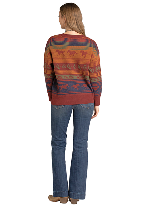 So comfy and so cute - this oversized crew neck sweater features a serape pattern with horses running across the chest area. Fall tones of rust, camel and navy pair perfectly with denim.