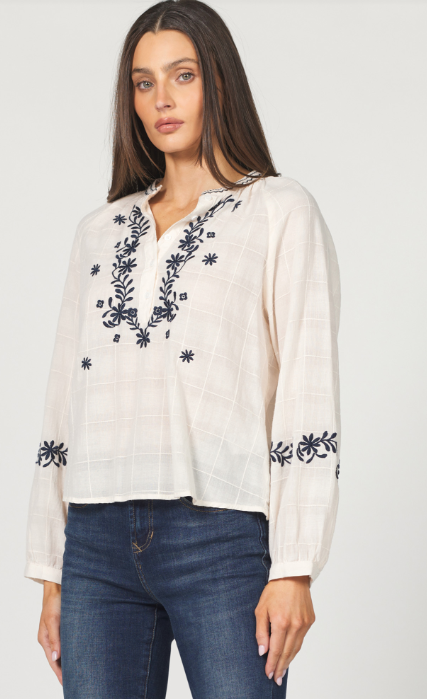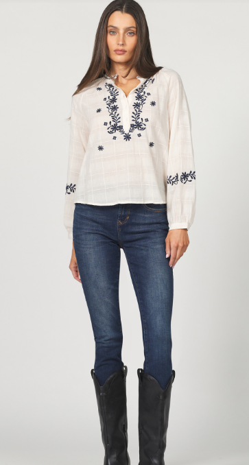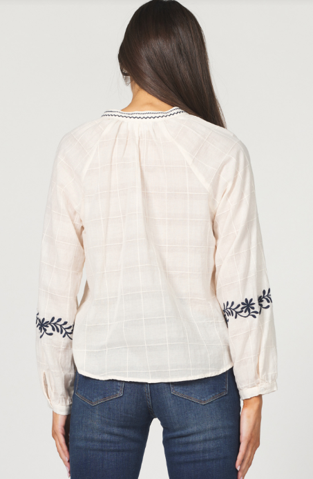 Soft cotton gauze with navy blue embroidery combine for a relaxed peasant vibe - pair Ella with denim or a skirt for the perfect summer look.