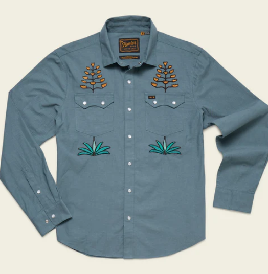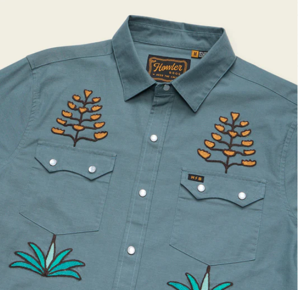 The Crosscut Deluxe is the most sought after item in our fall line year in and year out. Yes, the vintage inspired motif embroidery makes a big statement but so too do the bountiful pearl snaps, western yokes and robust stretch chambray. Collect these right along with your Gauchos for year-round Howler coverage.