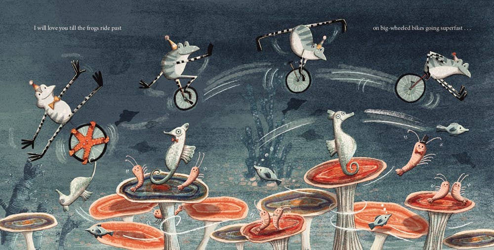 Love knows no bounds in this tender tribute to the depths of family love. For fans of Guess How Much I Love You—only funnier! This text extends the saying “I’ll love you till the cows come home” to the humorous extreme. Along the way there are yaks in Cadillacs, sheep setting sail, frogs on big-wheeled bikes, and more in this great read-aloud. At the end of the story, the author skillfully steps down the antics and finishes on the perfect bedtime note with everyone tucked up in bed.