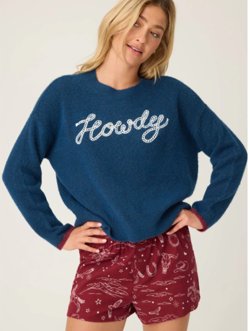 Desert skies, cowgirl energy, and soft cotton flannel—these boxer-style lounge shorts bring a free-spirited feel to your sleep lineup. Made in a classic twill weave with an easy elastic waist, the rich burgundy fabric is stenciled with riders on horseback, cowboy hats, horseshoes, soaring birds, stars, and mountain ranges. Whether you’re dozing off or taking it slow, they’re made to unwind without a care.