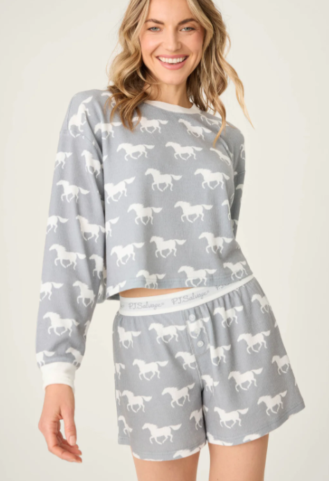 Sleep just hits different in a cozy thermal set that’s cute, comfy, and full of personality. This soft waffle-knit duo pairs a long-sleeve top with boxer-style shorts, both crafted from our baby peachy fabric with the perfect brushed feel. Covered in a galloping white horse motif, the soft grey set brings a free-spirited feel that’s made for unwinding without a care.