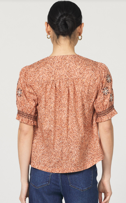 Romantic and elegant, the Ria brings a casual sophistication to your denim look. Super soft 100% cotton, a beautiful Fall color palette highlighted with sweet embroidery on the elbow length, smocked edge poet sleeves. Pair with the chocolate FIONA denim for the perfect look.