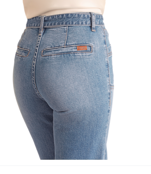 Trendy wider leg in a cool light vintage wash makes this belted jean a must have for Spring & Summer. Two front patch pockets and welted back pockets.