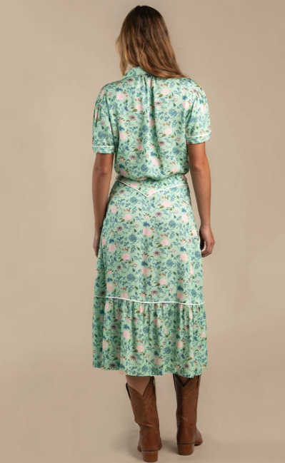 This drapey, silky skirt has a Western yoke shape at the back, with contrast piping at the waist and pockets. Arrow patches at faux welt pocket edges for western  detail. Midi length skirt, with one tier. Can be worn as a set with the Cheyenne blouse, or on its own.