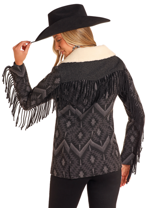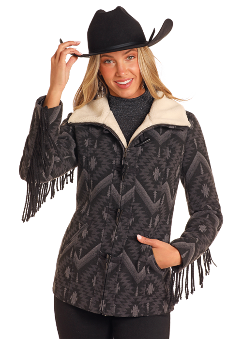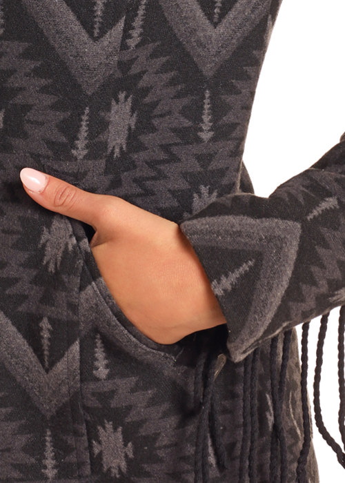Cozy & stylish, this warm, super soft wool blend Aztec print has a soft fleece lining with fun fringe down the sleeves, toggle closure.