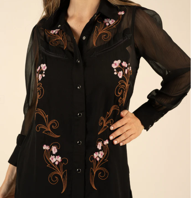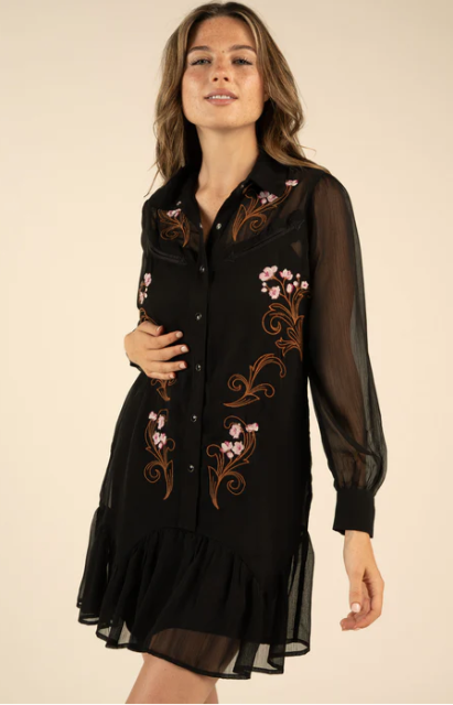 The timeless charm of a mini dress meets the wild and free spirit of the west. This is the one you reach for when the night calls for a little extra flair. Pearl snaps, sheer body, and eye-catching floral embroidery make this one as unforgettable as the amiga who’s wearing it.