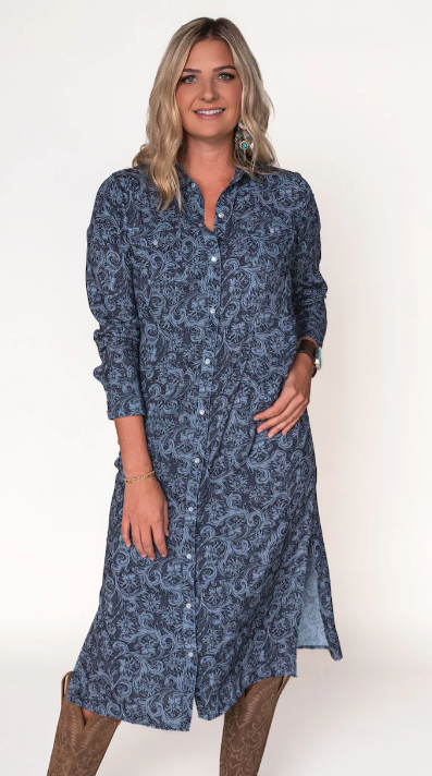 Boots may do the walking, but this dress does the talking. A Western fashionista’s dream, adorned with beautiful pearl snap buttons all down the front, with side slits and - of course - pockets. A timeless design that makes a bold statement in both comfort and style.