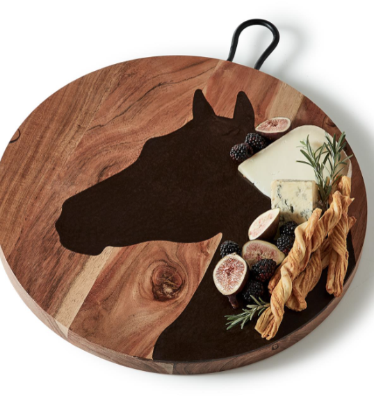 This beautiful serving board is crafted from Acacia wood with a profile horse resin inlay design. The iron handle completes this unique piece. This board is perfect for serving charcuterie, cheese, breads and much more! May also be used as a decorative stage for things in your kitchen or home.
