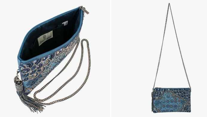 Denim dressed up right with gorgeous hand-beaded embellishments, embroidered detailing and a removable beaded tassel. 10 x 0.75 x 6.5", Strap Drop: 23", Removable crossbody chain strap, zipper closure, inside slip pocket, back slip pocket, fits a cell phone