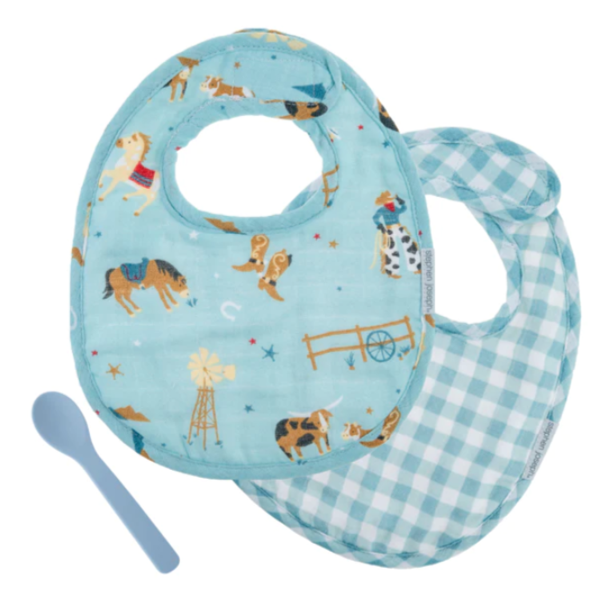 - Adorable set of super soft muslin bibs with a coordinating silicone spoon that are perfect for baby and make a great gift.