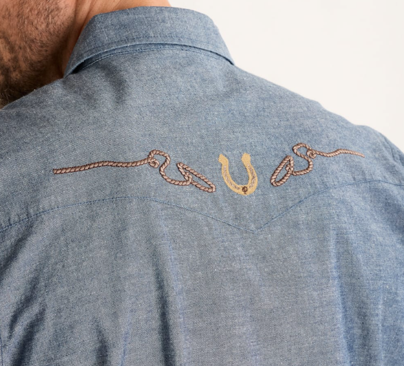 Inspired by our archives, this shirt features peaked front and back western yokes with embroidery, angled Gambler pockets with snap flaps, and premium snap closures. Made from 100% cotton soft-washed denim.