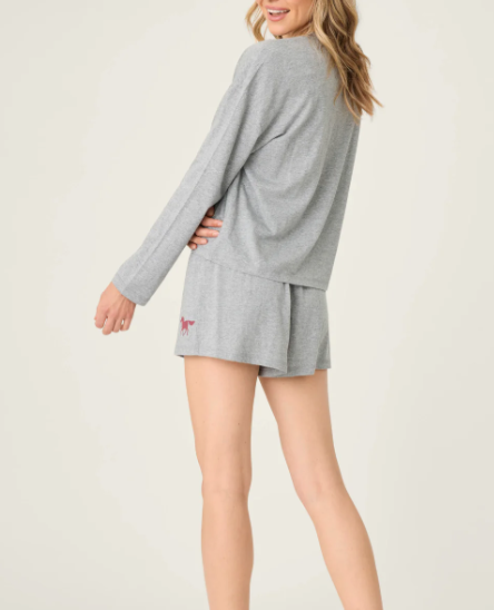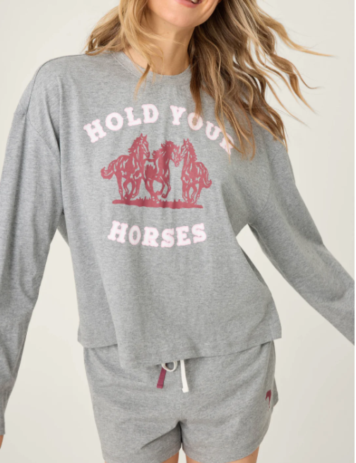 Easygoing comfort with a playful nod to the West. This heather grey short pajama set features a vintage-style horse graphic and “hold your horses” lettering, paired with relaxed drawstring shorts for warm-weather lounging.