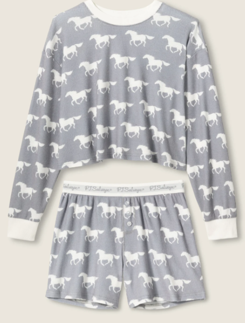 - Women’s grey pajama set with white horse print, long-sleeve top, and boxer shorts.
