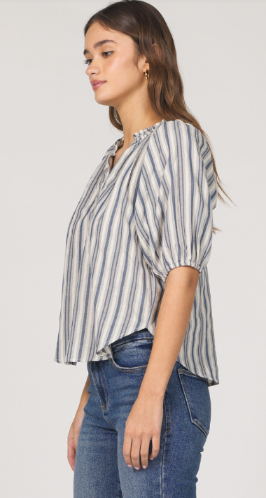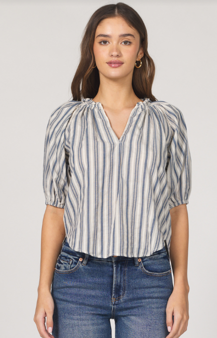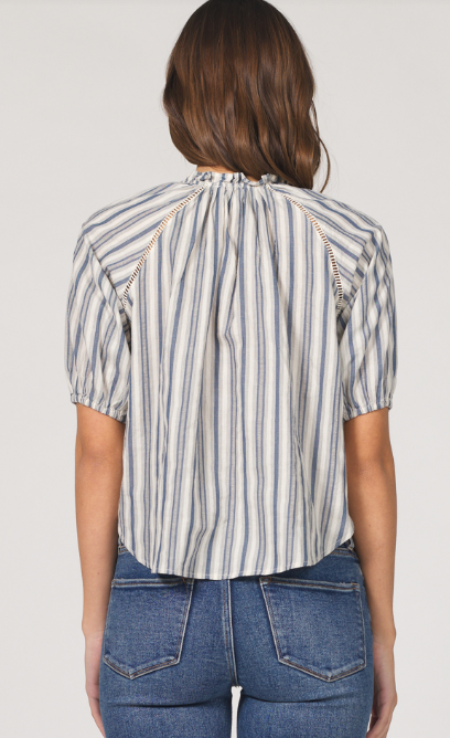 The Costa is a summery, romantic take on the Poet blouse - crisp navy and white stripes with insert ladder accent, self tie neckline and 3/4 sleeves.