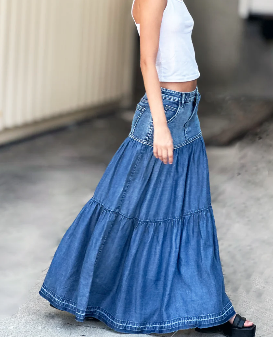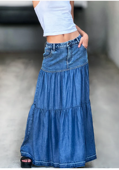 With a jeans-top/layered bottom construction, in our oh-so-soft trademark denim, the Fun Denim Maxi Skirt by Wash Lab is, well, built for fun!