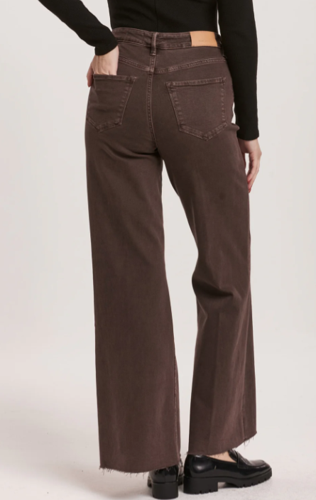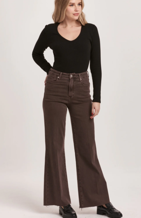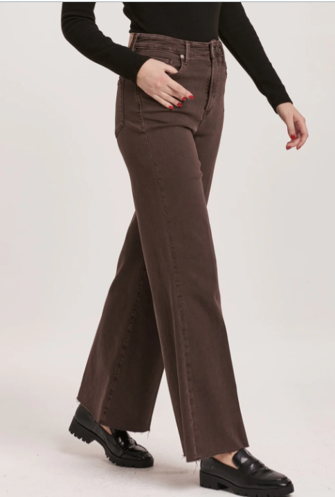 High rise wide leg jeans. It's cozy fit that sits at natural waist, embraces your natural curves and accentuates your hips and thigh. Full inseam on stretch denim featuring cut-off hem details add flair to these soft pants, available in designer colors, and finished with a center inseam press for a tailored look.