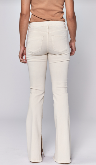 Bootcut leg finish with high rise. It's the spirited fit that sits slightly lower on the waist and fitted skinny in the hips and thigh. Full inseam on comfort stretch denim accented with slit at hemline