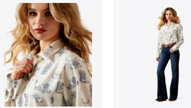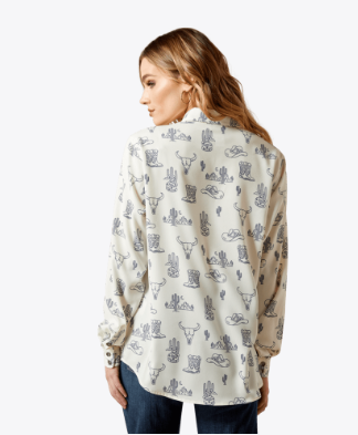 Soft cream and navy in a fun desert print make this shirt perfect to pair with denim.
