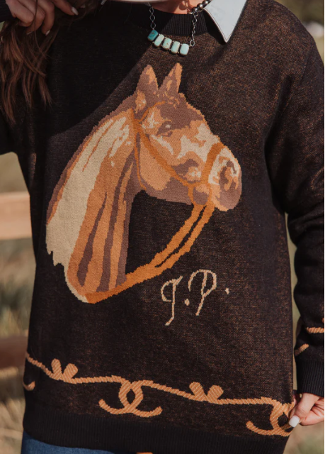 We love a horse graphic and this Ariana sweater is a stunner. Soft, lightweight 100% cotton.